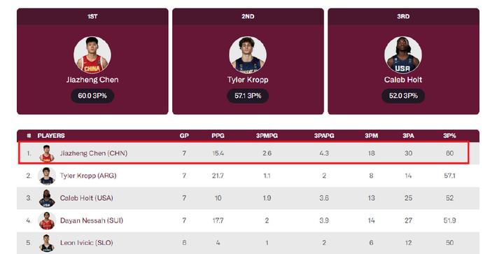 陈家政的投射能力太出色了,这届赛事他的三分球总计30投18中,场均投进2.6个三分球,三分命中率60.0%,在世青赛所有球员中是什么水准?答案是陈家政称霸了世青赛三分榜。在本届赛事所有投进5记以上三分球的球员中,陈家政的三分命中率排名第一,是当之无愧的世青赛三分王。